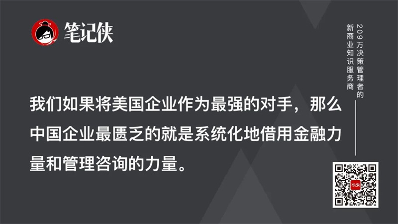 我们如果将美国企业作为最强的对手,那么中国企业最匮乏的就是系统化地借用金融力量和管理咨询的力量。