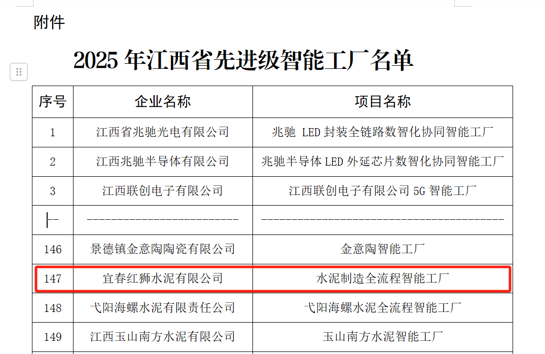日前,江西省工业和信息化厅正式发布《2025年江西省先进级智能工厂名单公告》,红狮集团旗下宜春红狮凭借卓越的智能制造水平,成功获评"江西省先进级智能工厂"称号。这一荣誉不仅是对宜春红狮数字化转型成果的充分认可,更是红狮集团"数智强企"在产业端落地见效的生动实践。